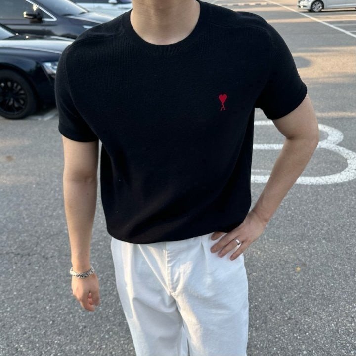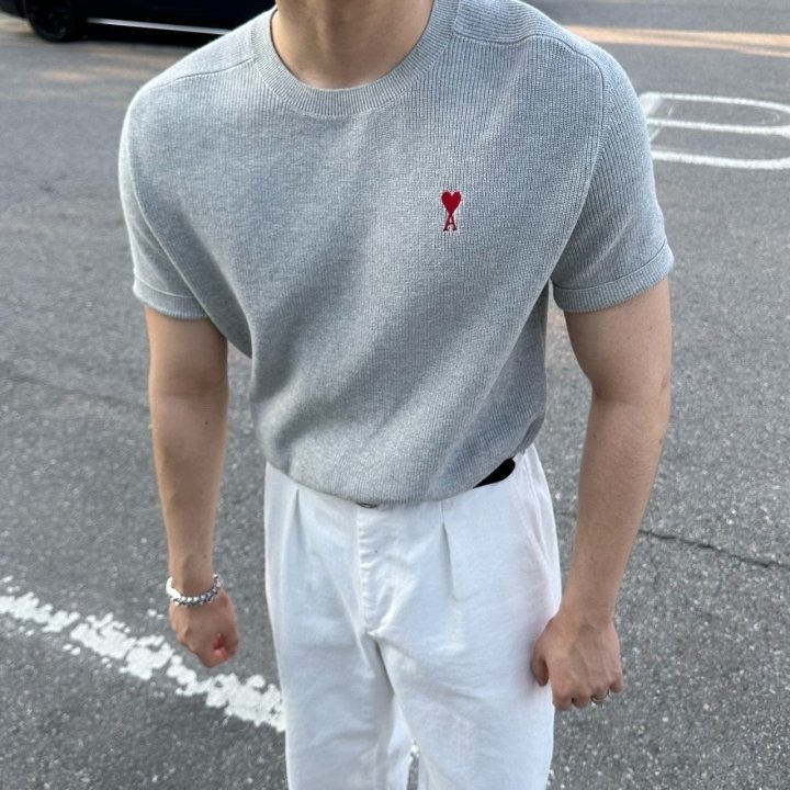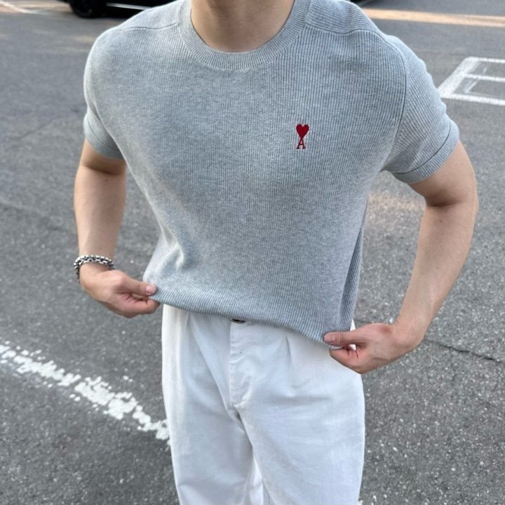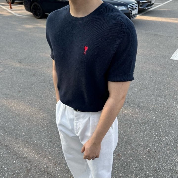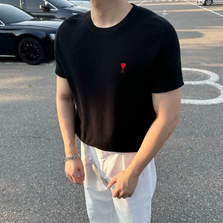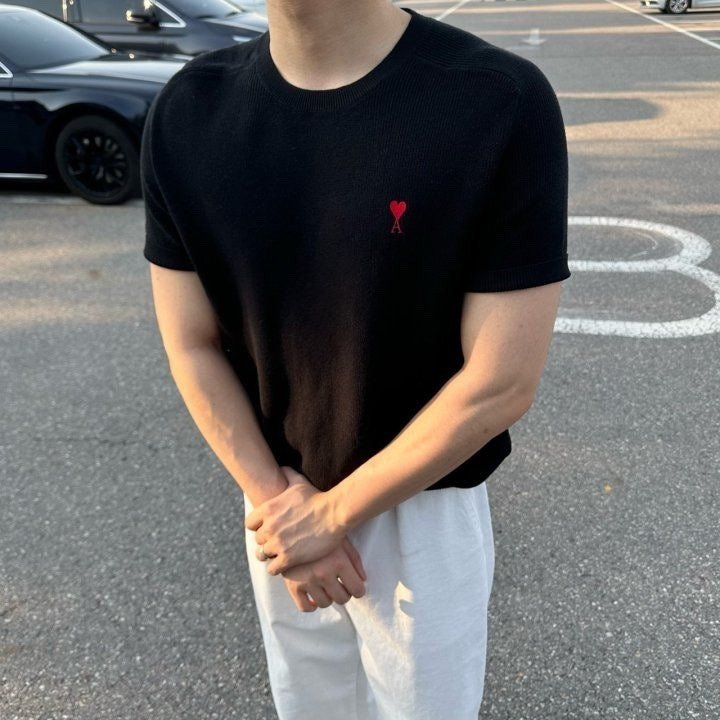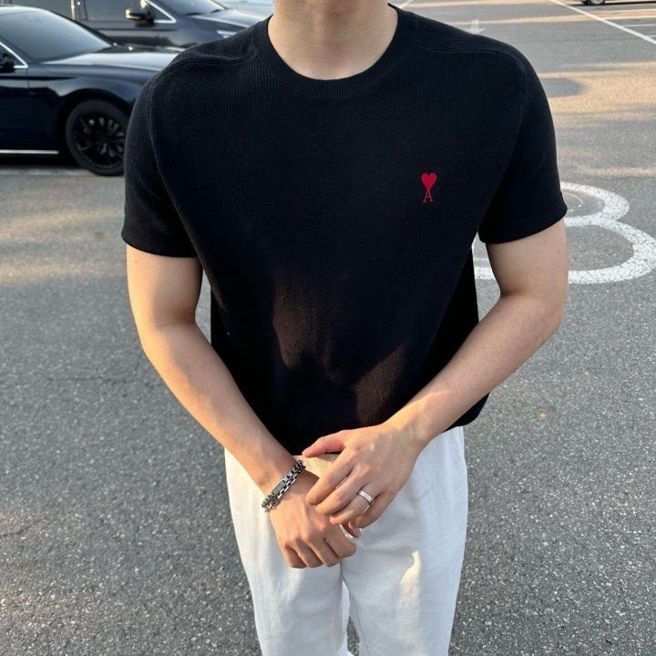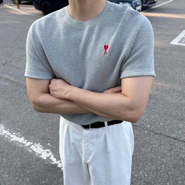 아미 하트 로고 라운드 나그랑 반팔 니트