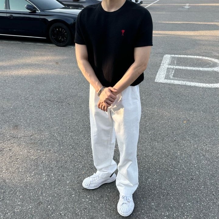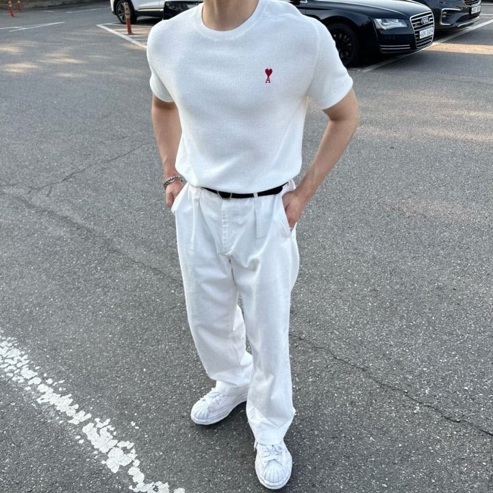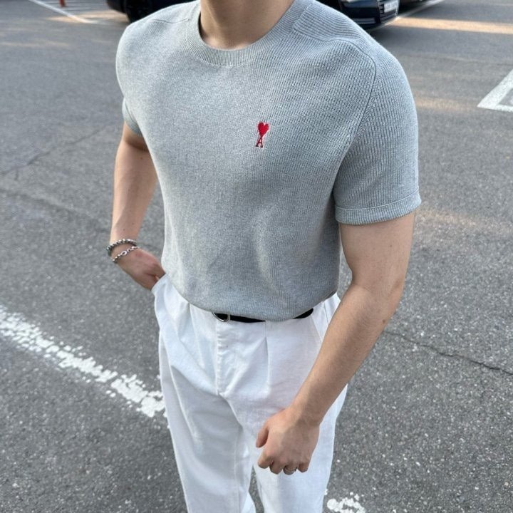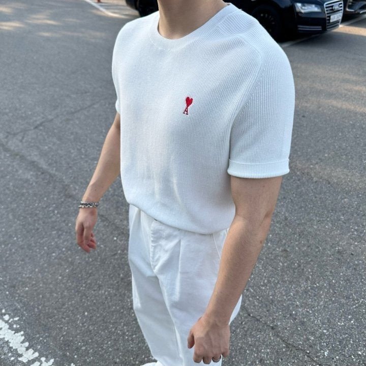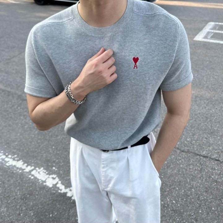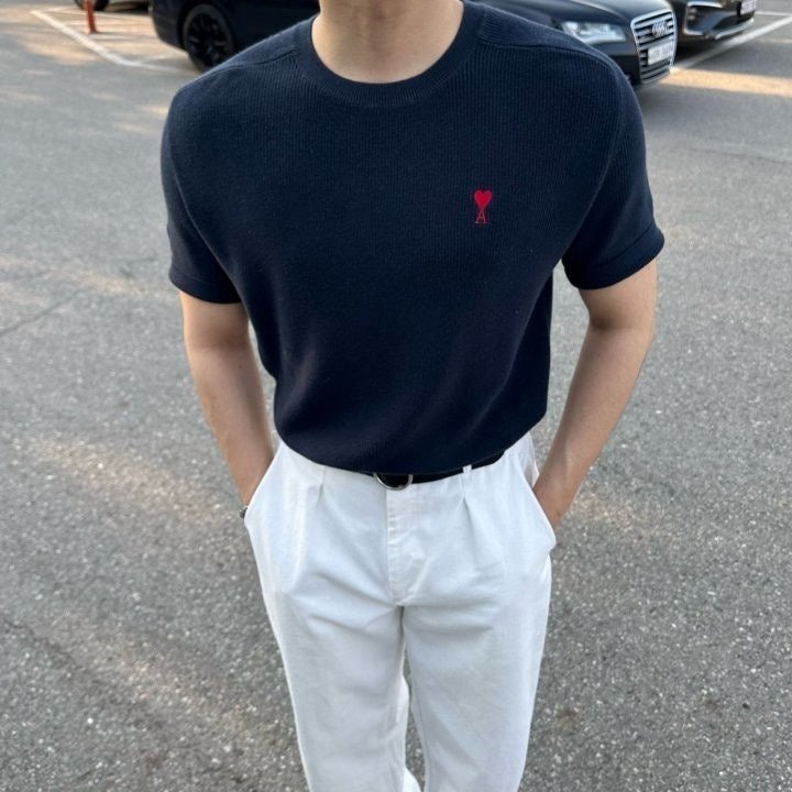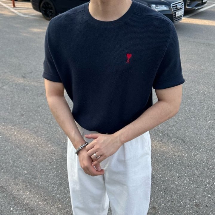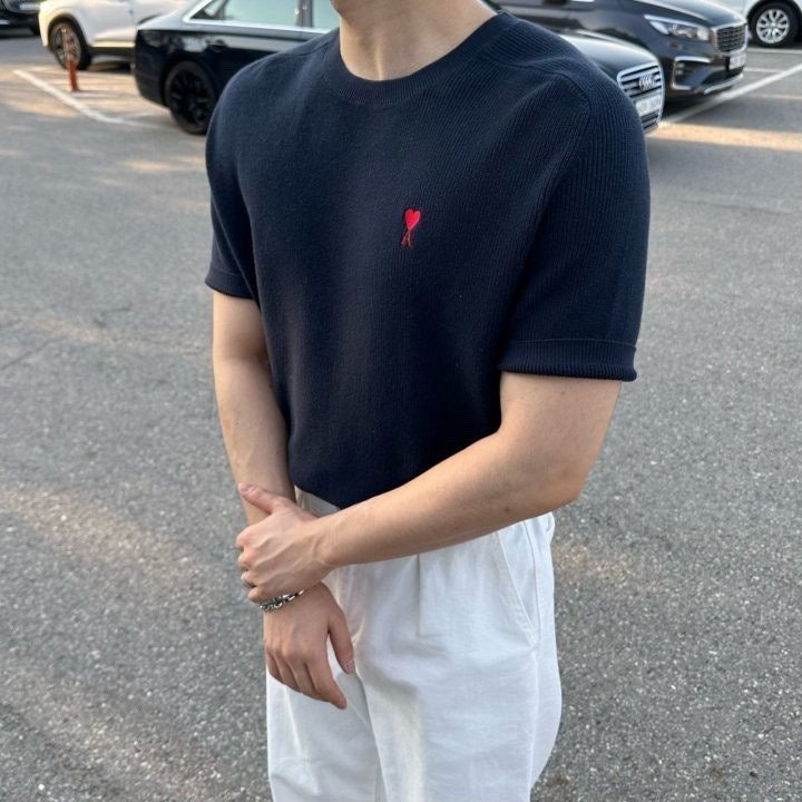 아미 하트 로고 라운드 나그랑 반팔 니트