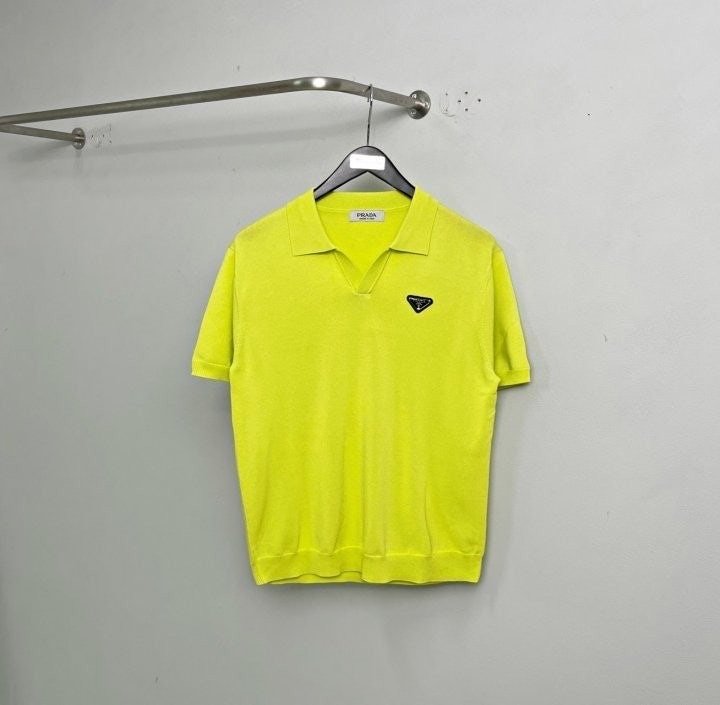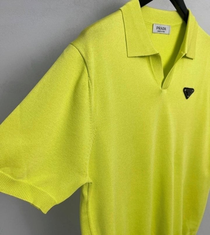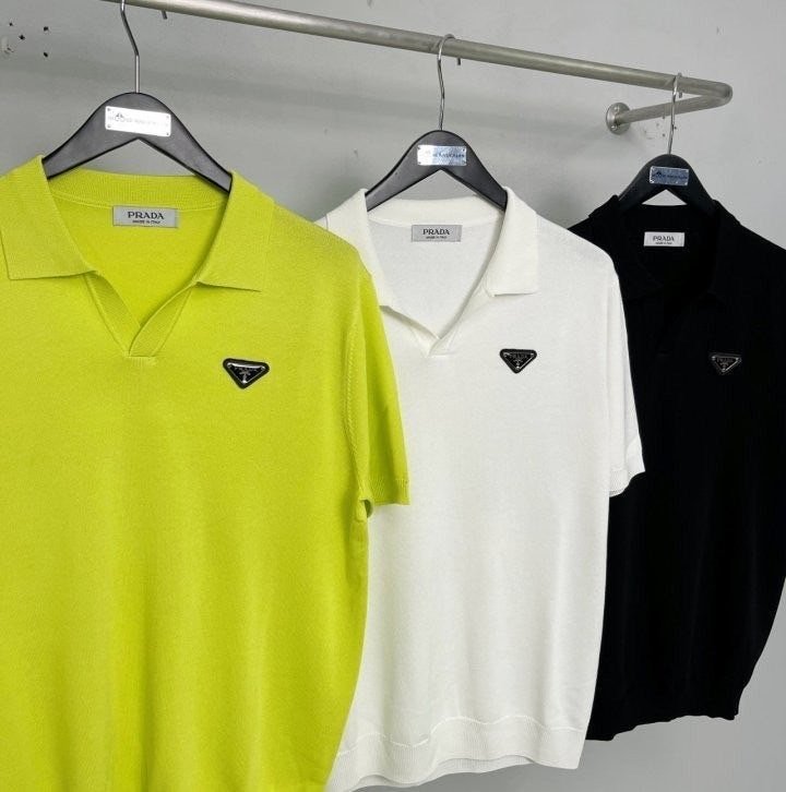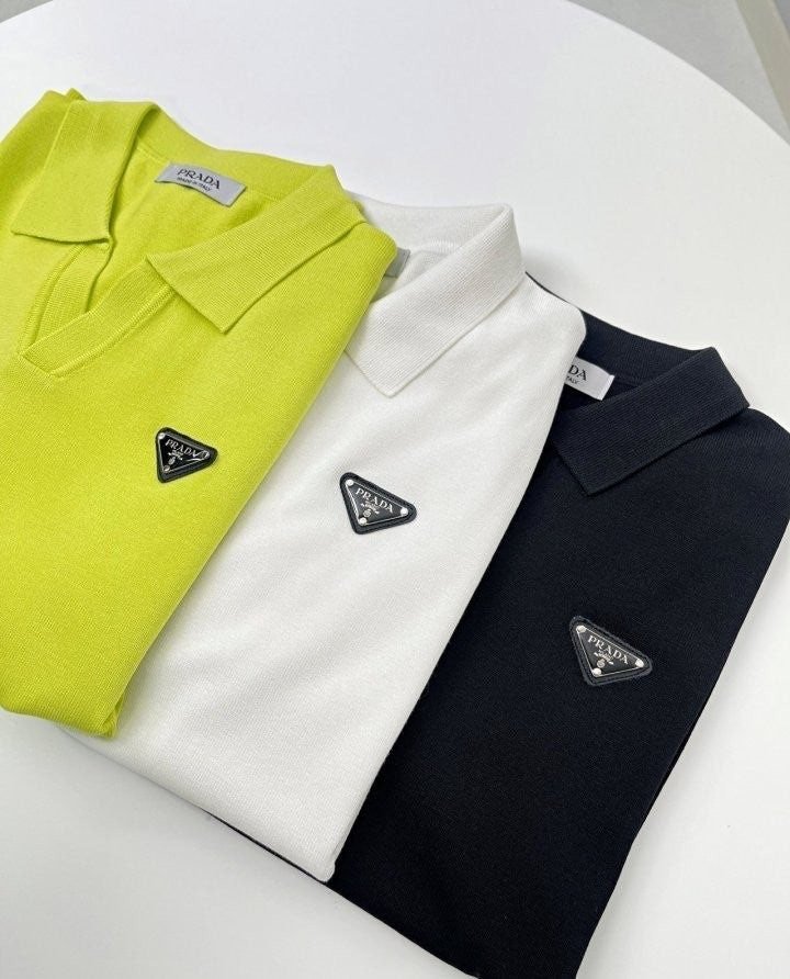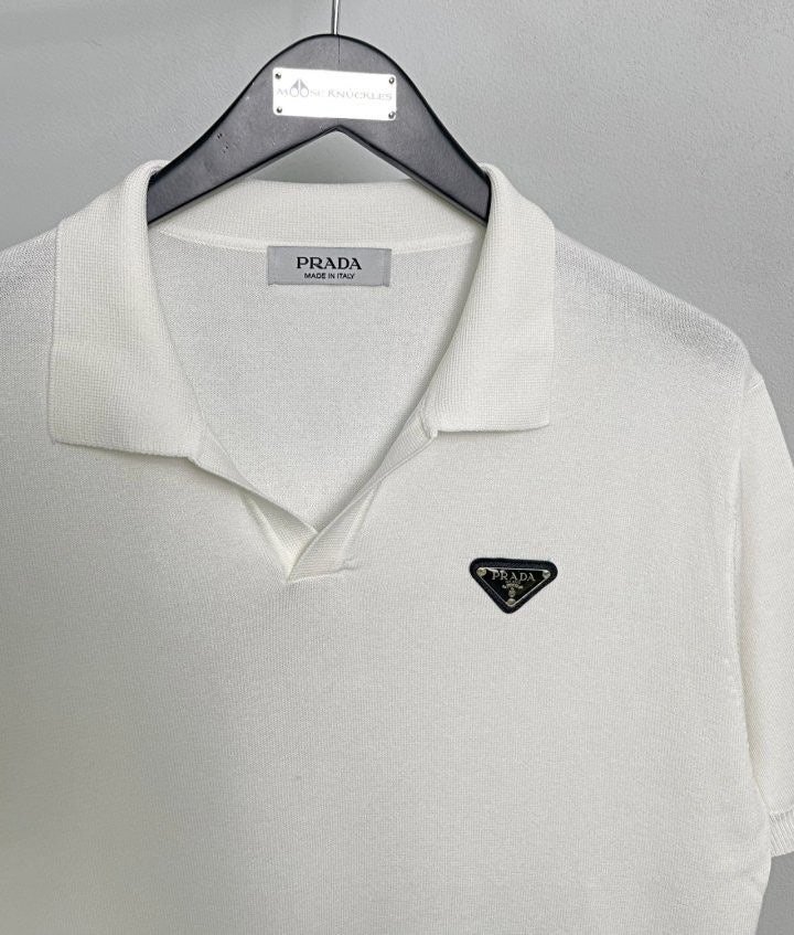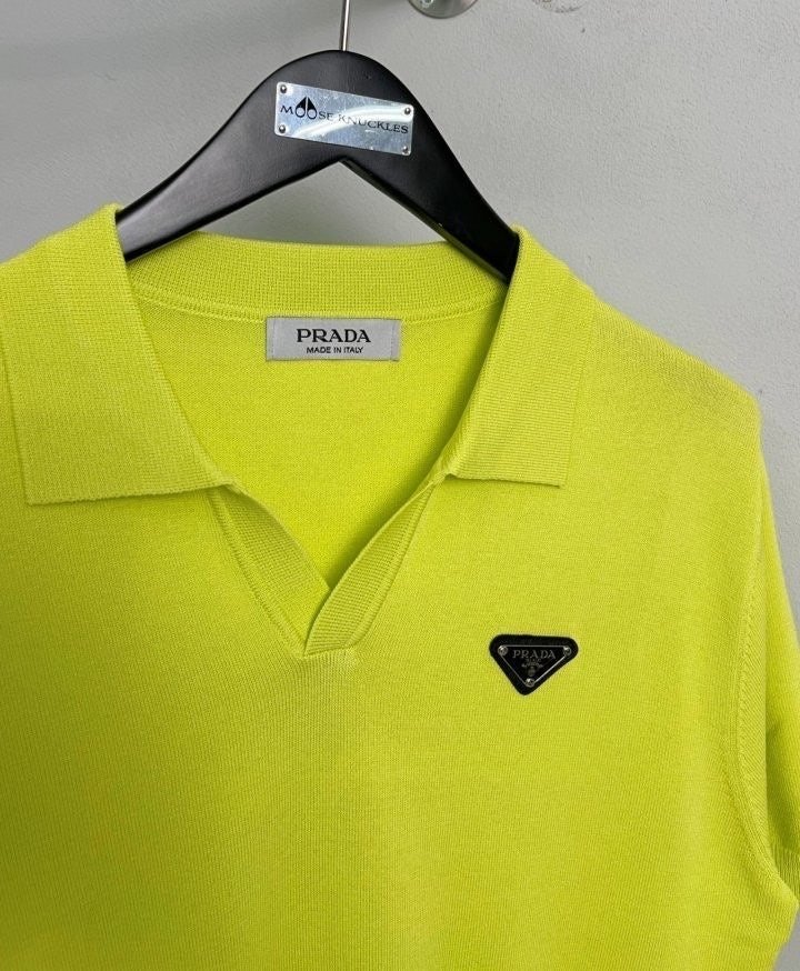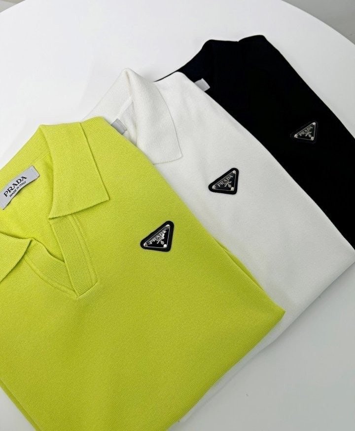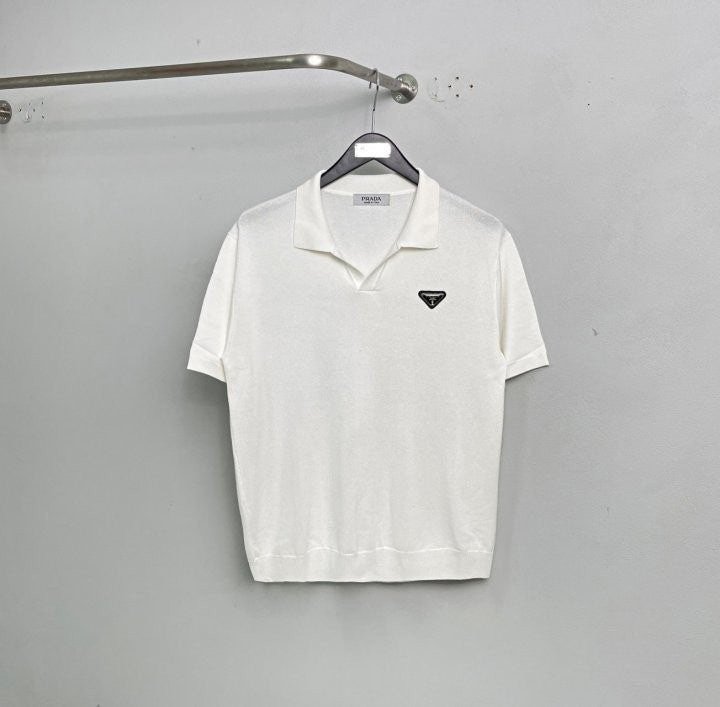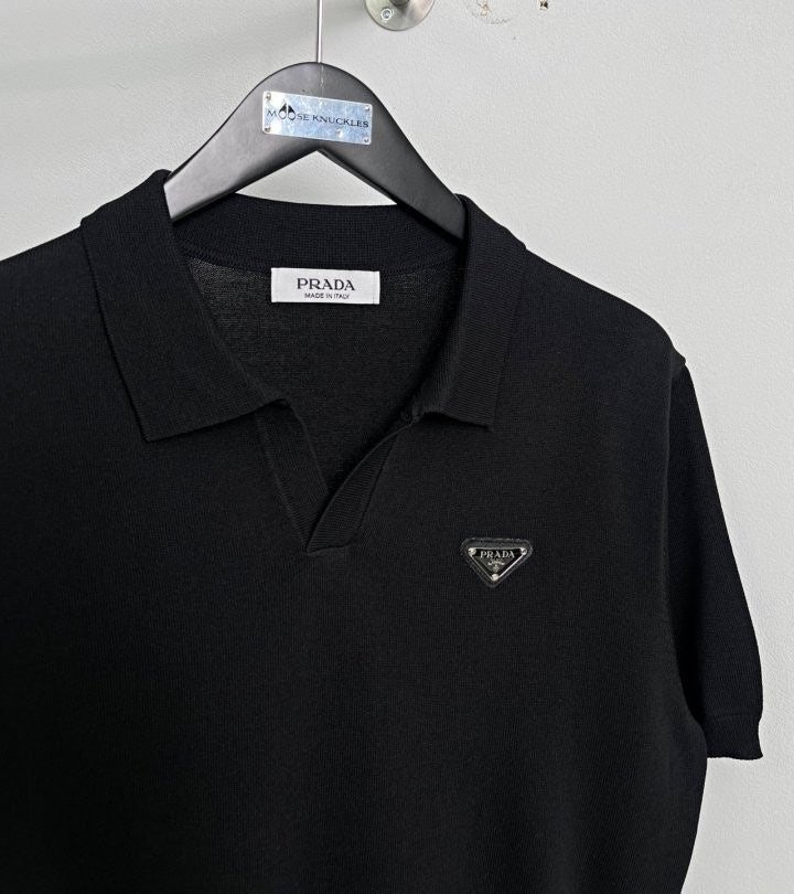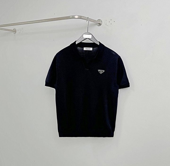 프라다 삼각 플레이트 오픈 카라 반팔 니트
