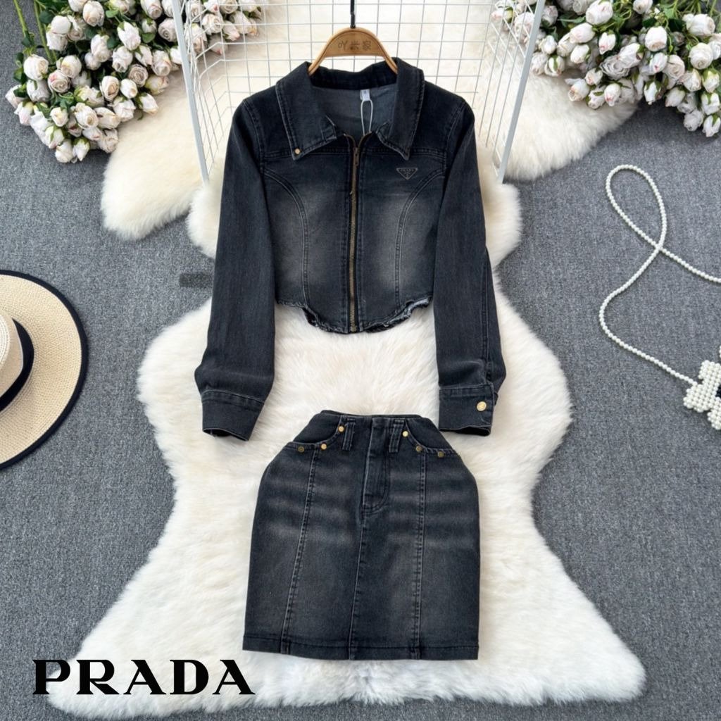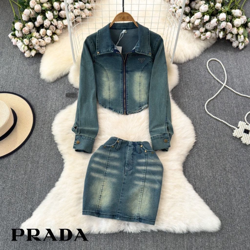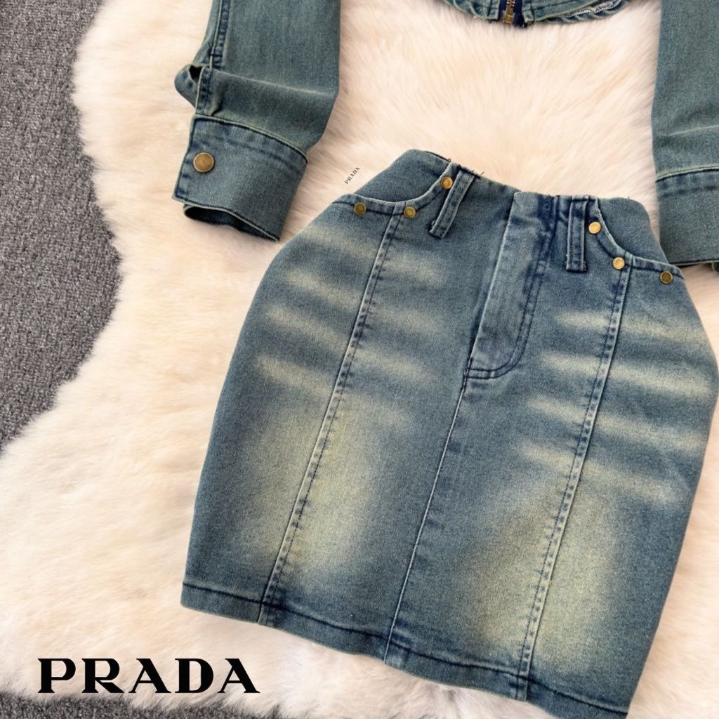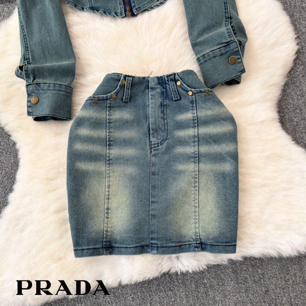 프라다 여성 플레이트 워싱 청자켓 스커트 세트